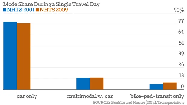 比勒(参与了我们的未来系列)和哈姆雷的研究基于对2001年和2009年国家家庭出行调查数据的分析,该调查结合了单日出行日记和更广泛的出行问卷,以追踪数十万美国居民的出行趋势。让我们从日常层面开始(我们在下面进行了图表展示)。超过四分之三的NHTS受访者仅依赖汽车满足他们的单日出行需求,尽管这种“单模式”驾驶的比例随着时间的推移略有下降,而无车的日常出行者的比例则有所上升。