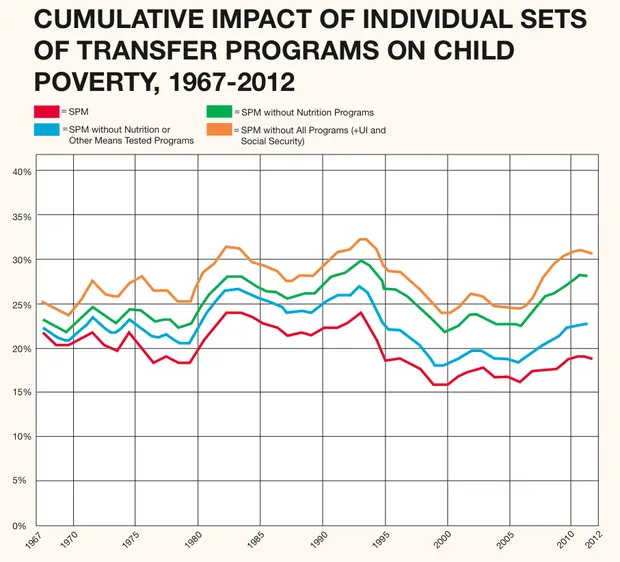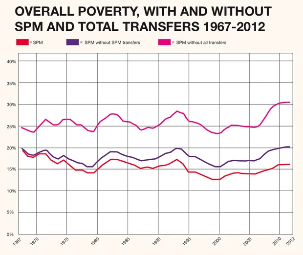这一直持续到今年早些时候,当哥伦比亚大学的研究人员决定尝试一下。使用 消费者支出调查 和 当前人口调查,他们生成了 过去50年的补充测量基础贫困率。该分析将反贫困和政府援助项目在抗击贫困方面的有效性置于新的视角。