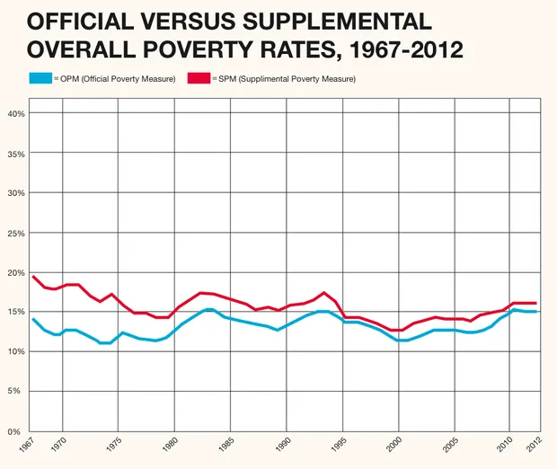 2013年基于补充指标的贫困率为15.5%——高于官方的14.5%率。换算成实际数字,这意味着在一个宇宙中(使用SPM测量)有340万美国人生活在贫困线以下,而在另一个宇宙中(使用OPM测量)则生活在贫困线以上。