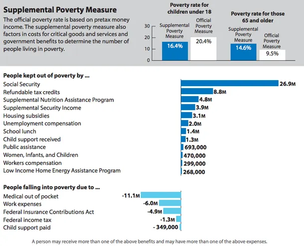 “[SPM]告诉我们贫困人群的真实状况,”布鲁金斯学会的高级研究员伊莎贝尔·索希尔说。“它包括他们可以获得的资源和他们所承担的成本。”