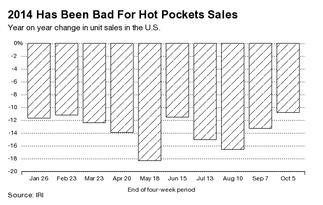 去年,公司试图通过 美食改造 来复兴其微波肉袋系列,吹嘘新改良版中有“优质肉块”和“真正的奶酪”。但即使这些准美食的点缀也无法掩盖热口袋是加工食品的事实,而此时 消费者正在寻求新鲜,以牺牲 冷冻选项 为代价。今年早些时候的一次牛肉召回 也影响了热口袋,使该产品与日益关注食品安全的消费者产生了矛盾。