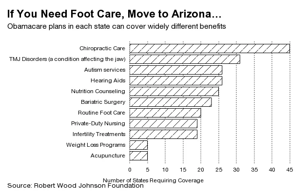 如果你希望你的奥巴马医保计划覆盖针灸,加利福尼亚是最佳选择。如果你需要足部护理,最好尝试亚利桑那州。华盛顿特区的计划会支付纽约不允许的减肥项目,但帝国州的奥巴马医保计划会覆盖手术以减掉那些相同的体重。