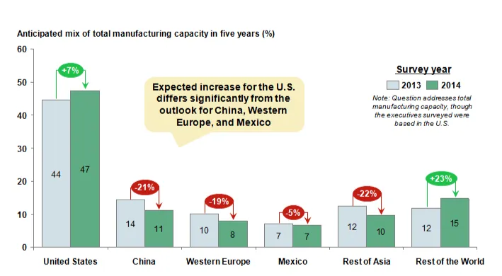 在五年内,美国高管们还预计他们近一半的全球制造能力将位于美国,这与几年前相比是一个重大变化。虽然样本量较小——252位年销售额至少为10亿美元的公司高管——但这反映了正在发生的变化。