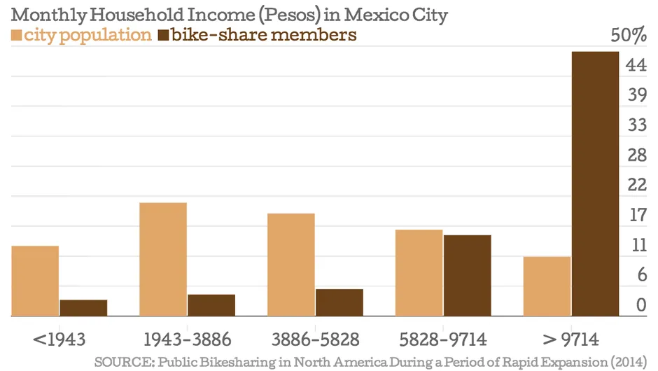 城市实验室综合来看,这些数字表明,自行车共享会员的临界点大约在家庭收入5万美元左右。当我们来到墨西哥城时,货币有所变化,但同样的趋势适用。相对而言,有钱的人加入了这个系统,而没有钱的人则没有加入。(作为参考,4000比索大约是300美元):