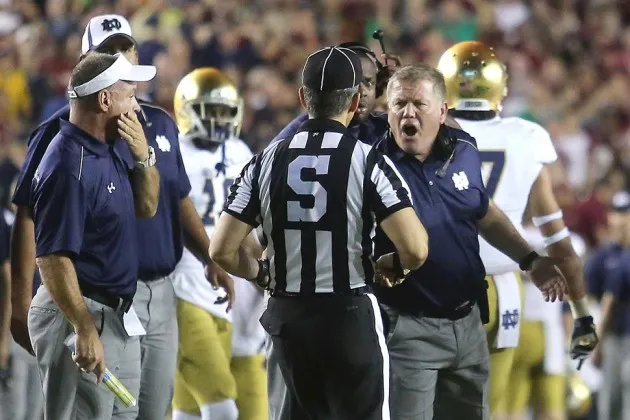 诺特丹教练布莱恩·凯利在10月18日塔拉哈西对佛罗里达州立大学的比赛最后时刻,因可能成为制胜达阵的进球被取消而对裁判大喊照片由乔·伯班克/奥兰多哨兵/MCT通过Getty Images提供大学橄榄球迷:是时候结束斑马阴谋了。