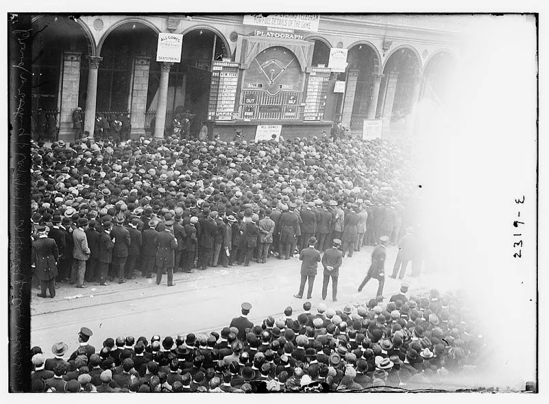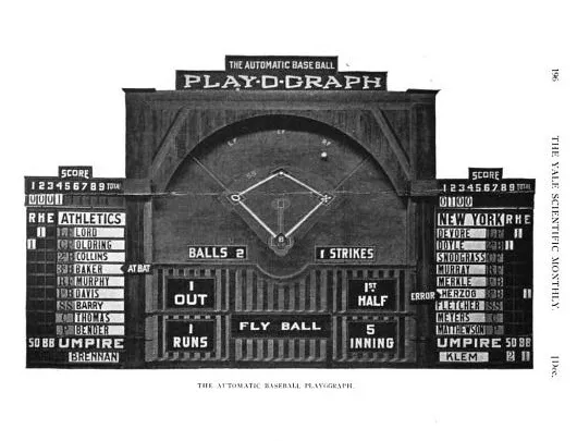 1911年,纽约市的纽约先驱报大楼外聚集了一群人,观看一个棒球比赛的广告牌图示。贝恩新闻服务/LOC到1890年代,电动模拟器主导了现场,每一项新发明都激发了另一项发明。出现了 康普顿电动棒球游戏模仿器、诺克斯电动计分器、游戏图表和杰克逊人偶棒球指示器等数十种其他设备。根据舒宾的说法,在1899年至1927年间,至少有44项美国专利被授予各种观看系统。