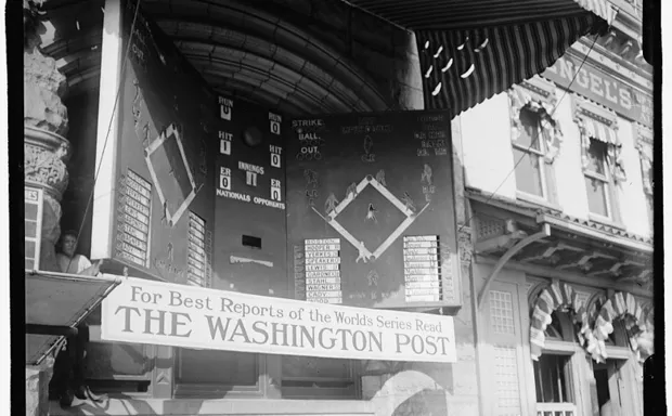 华盛顿邮报赞助的“公告板”,用于1912年波士顿美国联盟对纽约国家联盟的世界系列赛哈里斯与尤因/国会图书馆在这个国家,找到一个观看体育赛事的地方并不难——尤其是棒球。本周和下周,全国各地的酒吧(以及堪萨斯城和旧金山几乎任何有电视的地方)将播放每一场世界系列赛的比赛。几乎任何想看的人都可以观看。