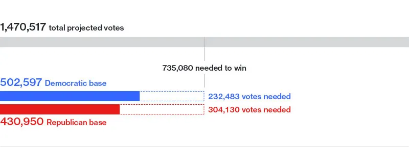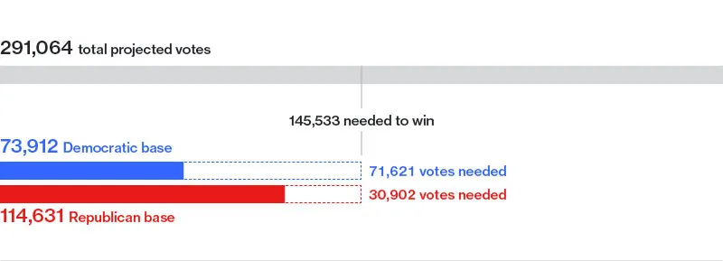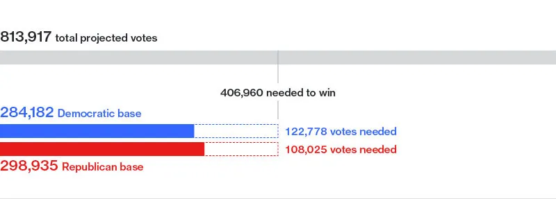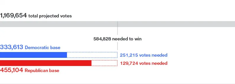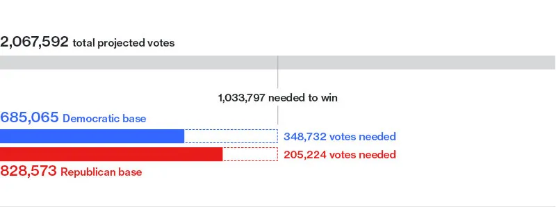 每位候选人都朝着同一个目标前进:刚好超过将要投出的总票数的一半。竞选战术家通常称之为“胜利数字”。这是候选人最安全的目标;在北卡罗来纳州或阿拉斯加等州,第三方候选人可能会从主要政党的基础中吸引选民,胜利者可能会以显著更少的票数出现。而这一切都始于政党基础。实质上,这相当于每位候选人可以在联邦选举中理所当然地获得的、确定会投票的选票数量,按照标准的两党路线进行。整个政治竞选可以理解为通过三种方法之一,从自己的基础到达胜利数字的项目。