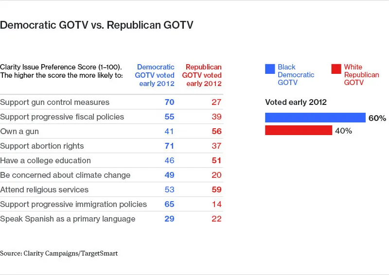 民主党逐渐在培养他们的联盟,以利用北卡罗来纳州的提前投票窗口——今年超过一半的哈根的投票目标在2012年选举日之前投票。但即使是可靠的选民也需要重新训练以适应新规则,这项任务对两个政党的影响将有所不同,尤其是当他们的战术目标从种族角度来看时:哈根的非裔美国人投票目标中有三分之五提前投票,而提利斯的白人投票目标中不到五分之二提前投票。