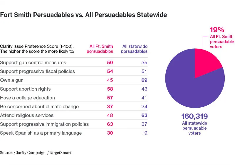 该州的西北角是一些最大雇主的所在地,包括沃尔玛、泰森食品、J.B.亨特和阿肯色大学,54,735名新注册选民可能是为了高端工作而被吸引到这里。该州五分之一的可说服选民生活在福特史密斯媒体市场,该市场涵盖费耶特维尔、斯普林代尔和罗杰斯,来自任何候选人的南方民粹主义在这里不太可能像其他地方那样引起共鸣——尽管科顿的管理背景可能会有所帮助。