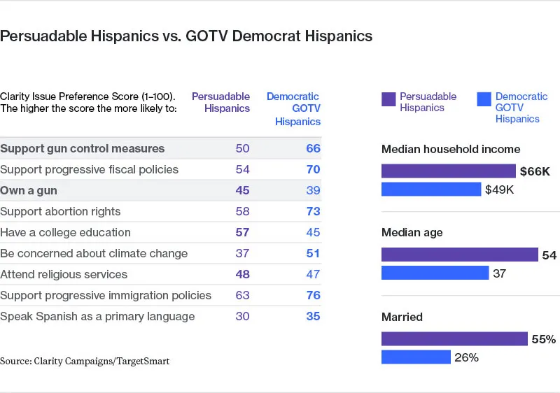 虽然民主党人常常在丹佛地区寻找讲西班牙语的选民目标——该州三分之四的选票来自这里——但加德纳可能会将他的拉丁裔外展重点放在保守的科罗拉多斯普林斯,在那里,拉丁裔可说服者的比例不成比例地集中。他们的特征与民主党的拉丁裔选民目标截然不同:在对移民的态度上更保守,并且不太可能用西班牙语交流。加德纳可以通过 在一个在山区西部特别引起共鸣的社会问题上进行有针对性的宣传:近一半的可说服拉丁裔选民可能拥有枪支,因此对约翰·希肯卢珀州长在2012年奥罗拉枪击事件后提上日程的那种控枪政策持有非常可疑的支持态度。