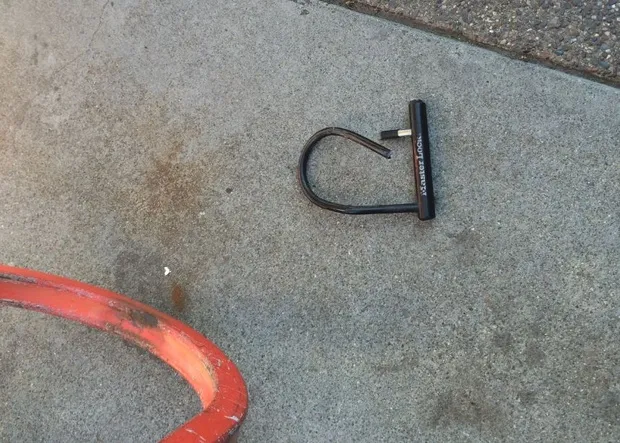 弗里德曼负责该部门的推特账号,@SFPDBikeTheft,并处理过相当多的 自行车盗贼。在我的案例中,小偷显然没有使用电池驱动的 角磨机,他说,这可能是上面图片中1形锁部分的情况。(根据 这些 视频,那个锁也可能被螺栓切割器剪断。)而我遇到的BART警官说这可能是撬棍,但弗里德曼不同意。