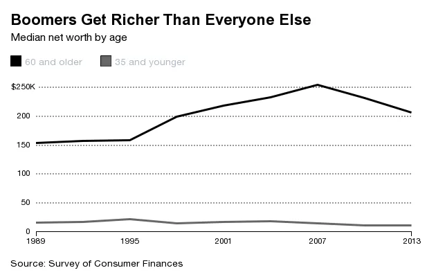 在1989年,平均老年人的财富是年轻人的九倍。到2013年,老年人的财富是年轻人的18倍。这种差距的增加反映了几个趋势:更高的学生债务、住房市场的波动,以及美国人现在自己为退休提供资金的事实(上述财富数据不包括确定收益资产;第一张图中的个人储蓄率包括在内)。尽管如此,按大多数说法,美国人临近退休时仍然没有储蓄足够的资金。当你考虑到,根据许多估计,100万美元的退休账户——只有10%的人口积累到的财富水平——每年仅能产生4万美元的收入时,谁是富人,谁是中产阶级就变得不那么明确了。
