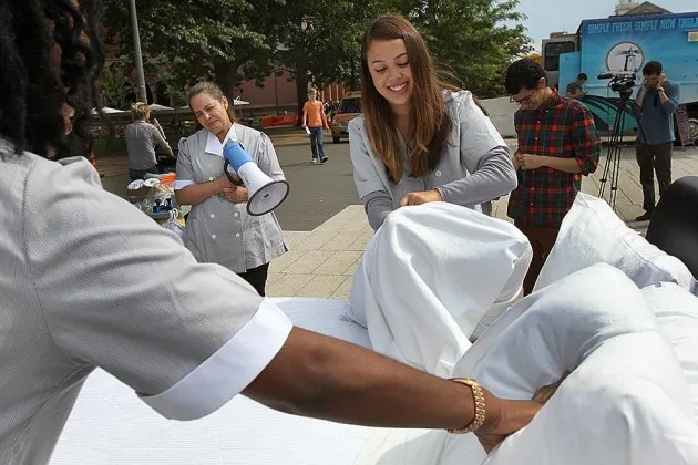 哈佛大学的一名学生正在接受哈佛拥有的希尔顿逸林酒店的清洁工作人员教授如何整理床铺照片由Suzanne Kreiter/波士顿环球报通过Getty Images提供哈佛大学校长德鲁·福斯特将在周二受到数十名学生和酒店清洁工的欢迎,还有28个床和沙发的剪影。学生和工作人员将在哈佛庭院聚集,呼吁福斯特与一位希望开始谈论组建工会而不冒失去工作的哈佛拥有的希尔顿逸林酒店的员工会面。这些道具是为了说明工人们的主要投诉之一:他们必须搬动的沙发床的重量。