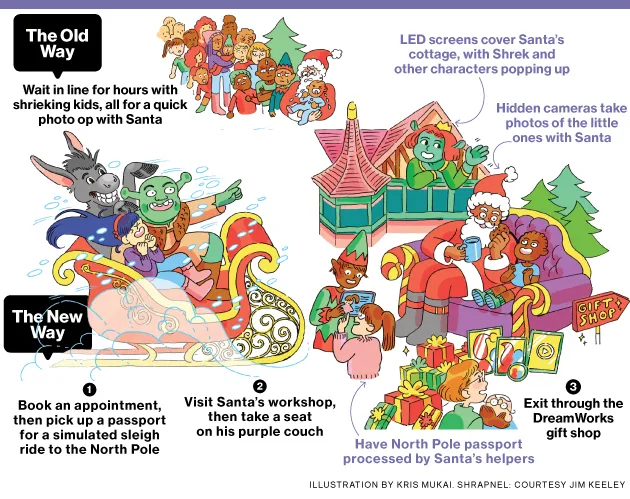 在当地购物中心拜访圣诞老人这个圣诞节将进行一次大改造,得益于 梦工厂动画及其最大的明星,史瑞克。杰弗瑞·卡茨伯格的独立电影工作室将于11月6日开始在美国的八个购物中心推出梦工厂梦幻乐园。梦工厂的高管表示,这个景点将允许父母和孩子个性化他们的北极之行,免去排队和人群。“我们非常非常努力地确保这一切在视觉上都令人愉悦,”梦工厂动画的零售开发和娱乐负责人保罗·库尔扎瓦在洛杉矶的一个原型展览中说道。
