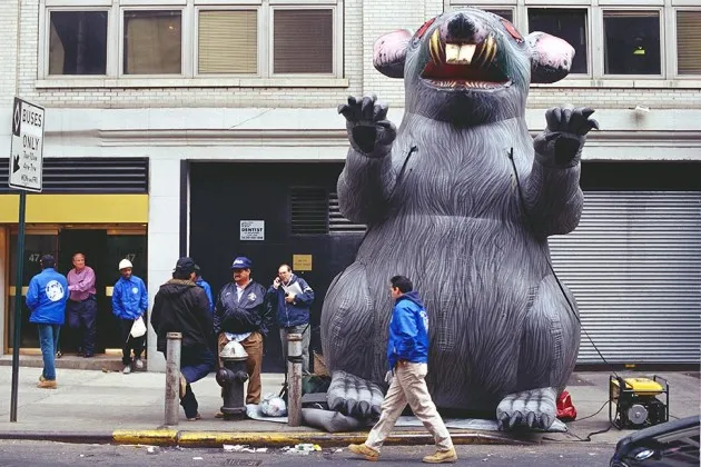 摄影:Bob Krist/Corbis高耸的老鼠气球—高达六到25英尺,常被称为“丑陋的老鼠”—是一个常见且有时引发争议的景象。这是工会最常用来抗议雇主的噱头,但充气老鼠有时也被工会用来抗议其他工会,并且在一个讽刺的举动中,一个商业团体抗议国家劳动关系委员会的听证会时也使用了它。老鼠似乎有些疲惫:去年,AFL-CIO的建筑和施工贸易部门宣布正式退休这个气球老鼠,因为它“象征着30年前的恐吓战术。”