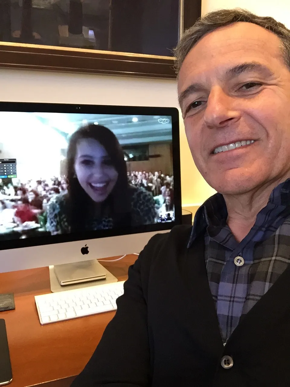 迪士尼首席执行官鲍勃·艾格手持一款自己的星球大战动作玩偶,同时与我的大学班级进行Skype视频通话