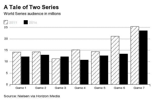 强劲的第七场比赛数字至少可以平息关于棒球衰退的讨论一晚。它是一个令人惊讶的强劲收尾,第六场到第七场的观众人数大幅上升,远超2011年的水平: