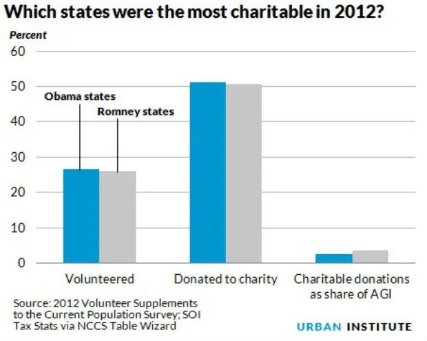 17个最慷慨的州,按捐赠给慈善机构的收入比例计算,在2012年选举中投票支持共和党总统候选人米特·罗姆尼。佛罗里达州以18名的身份成为投票支持巴拉克·奥巴马的最慷慨州。