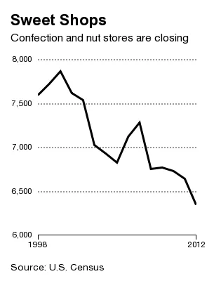 小型糖果店可能需要一些帮助:从1998年到2012年,糖果店的数量下降了17%,降至6,342家,这是最后一年可获得一致的人口普查数据。