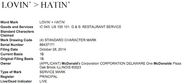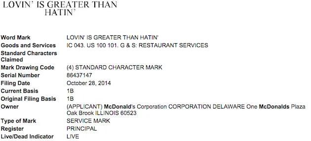 然而,似乎金色拱门一直在计划对“爱”和“恨”的新用法。Burgerbusiness.com报道麦当劳已申请商标“爱 > 恨”以及短语“爱大于恨”于美国专利商标局。
