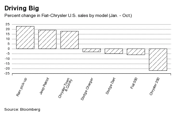 考虑一下菲亚特克莱斯勒这一品牌群体。它车库中所有类似于常规大小汽车的车型——从道奇达特到克莱斯勒200轿车——今年的销量都出现了下滑。所有更大、更粗犷或两者兼具的车型——吉普车和皮卡——销量却激增。即使是克莱斯勒城与乡厢式车在厢式车中也非常受欢迎。