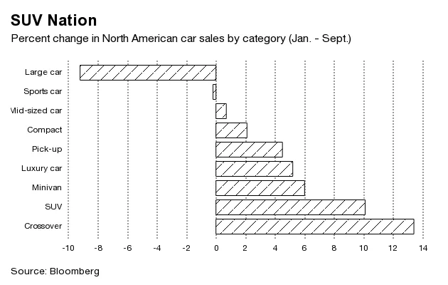 这种超大号趋势扩展到了整个美国汽车工业。在今年的前九个月,传统SUV和所谓的跨界SUV的销量增长了12.2%,远远领先于其他所有细分市场。那些擅长仅仅运送几个人的机器——紧凑型和中型汽车——销售结果停滞不前,而大型老款轿车则越来越像恐龙。