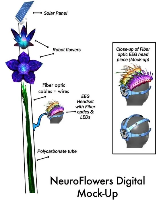 最搞怪的奖项颁给 “神经花,”一个“互动艺术作品,聚集人们探索和可视化他们的脑活动,并练习控制他们的心理状态,使机器人LED花朵绽放并改变颜色。”