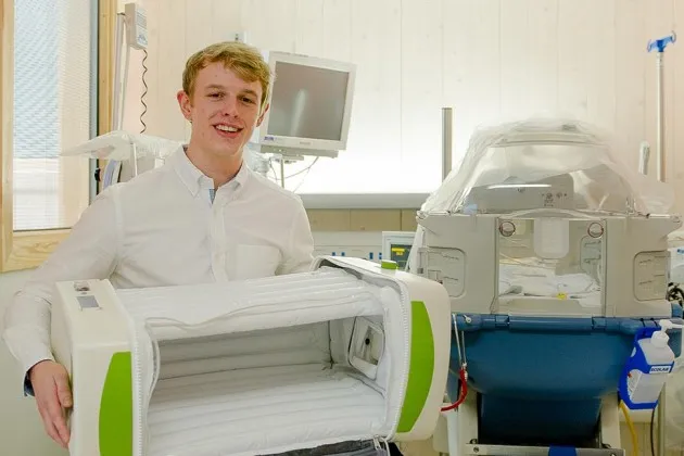 詹姆斯·罗伯茨与他的MOM充气保温箱感谢戴森根据世界卫生组织的数据,超过一百万名婴儿因早产并发症而死亡,包括低体温。四分之三的这些死亡可以通过简单的干预措施避免,而詹姆斯·戴森选择了一个用于难民营的充气保温箱作为他国际设计竞赛的获胜作品。发明者詹姆斯·罗伯茨希望他能使他的充气设备,即MOM,变得足够经济,以便在最需要这种技术的发展中国家使用。