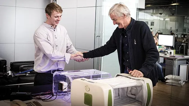 詹姆斯·戴森和詹姆斯·罗伯茨与他的MOM充气保温箱感谢戴森