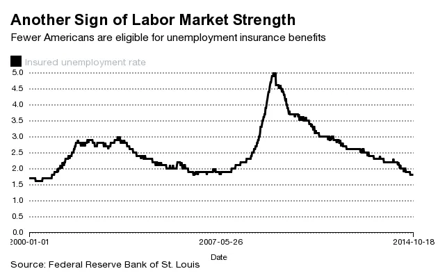 投保率是有资格领取失业保险的劳动力的比例。它低于普通失业率,后者是失业并积极寻找工作的劳动力的比例。投保率在2009年5月至6月达到4.9%的峰值;四个月后,普通失业率达到10%的峰值。此后,投保率已降至仅1.8%,而普通失业率在9月份为5.9%。上一次投保失业率如此之低时,普通失业率仅为4.6%。