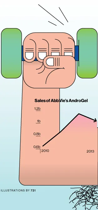睾酮注射自1950年代以来就已在临床上使用,但直到2000年代初,易于涂抹的外用凝胶上市后,这种激素才开始流行。根据市场研究公司 Kantar Media 的数据,AbbVie和Lilly在2013年共花费了1.19亿美元用于宣传睾酮替代疗法的电视广告。这是有效的:FDA数据显示,2013年有230万人获得了睾酮处方,较2010年的130万人有所增加。只有一半的这些男性被诊断为睾酮缺乏症;四分之一的人从未进行过激素水平测试。