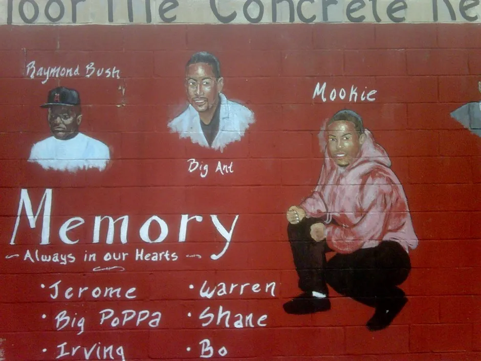 在布鲁克林的贝德福德-斯图伊维森特,超过五十幅纪念壁画涂抹在公寓楼、杂货店、小巷和游乐场的侧面。肖恩安息在我公寓附近的马西大道。谢尔顿在汤普金斯和盖茨大道的一家熟食店被铭记。何塞装饰着一小片迈特尔街。马修在斯鲁普和格林街。果汁在拉法叶和富兰克林街。哈尔西街和汤普金斯大道拐角的一家五金店悼念三十个人,从已故的当地亲人到文化英雄马丁·路德·金博士和杰基·罗宾逊。