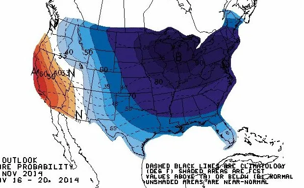深蓝色区域在接下来的六到十天内有较高的低于平均气温的概率。美国国家海洋和大气管理局现在是购买保暖内衣的好时机。一股巨大的北极冷空气正在袭击美国,到星期四,气温将下降到低于平均水平10到20度。