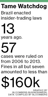 巴西证券和衍生品交易所BM&FBovespa的自律机构去年表示,它发现了91,000笔显示不规则交易量或股价波动的交易。巴西相当于美国证券交易委员会的CVM在2013年仅对10个案件作出了裁决,今年则对三个案件作出了裁决,所处以的罚款也很小。在2006年至2013年间,CVM裁决的57起内幕交易案件中,除了七起外,所有案件的罚款都低于160,000美元。