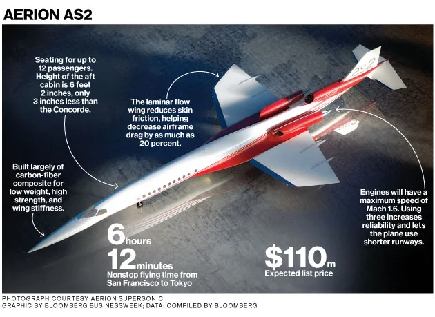 Aerion 预计 AS2 将比现在从旧金山飞往东京所需的 10 小时 25 分钟缩短超过 4 小时,这将推动对 600 架此类喷气机的需求,尽管每架售价为 1.1 亿美元。“从先行者的角度来看,这里有一个相当可观的市场,”麦卡托尔说,并指出 Aerion 的先驱优势:不会有四家超音速商务喷气机制造商的空间。