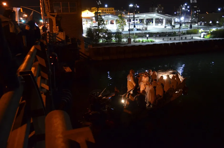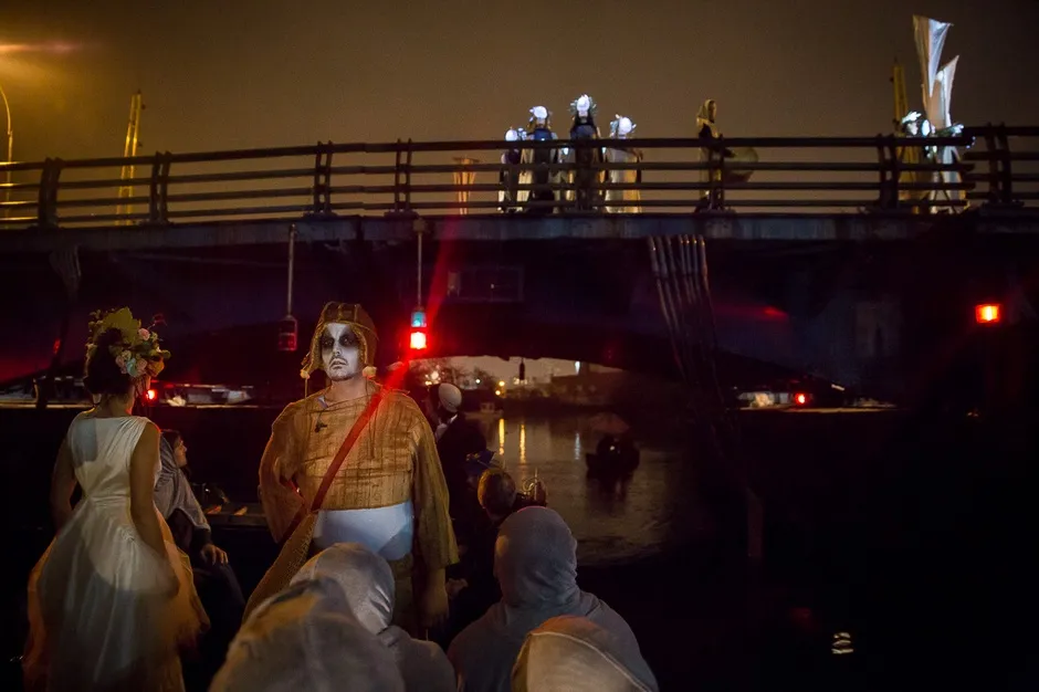 珀尔塞福涅(阿瓦·艾森森),最右边,从堤岸上登上船只。演员们不得不翻越围栏和灌木丛才能到达他们的场景。丹·格拉斯在水上本身就是一种改变视角的体验,但在夜晚的工业海事基础设施中,这种体验简直超现实。在演出后驾驶船只前往它的夜间藏身之处时,斯塔克问:“你看到我们即将到来的这座桥的净空吗?”我们在几英尺高的车流上方滑过钢格栅的路面。“因为潮汐的原因,之前的净空只有九英寸,”他说,展示人们必须低头的样子。“人们都惊呆了;他们喜欢这样。当你达到那些标记时,观众就会说,哦,我的天!我明白了!你不应该在这里。”