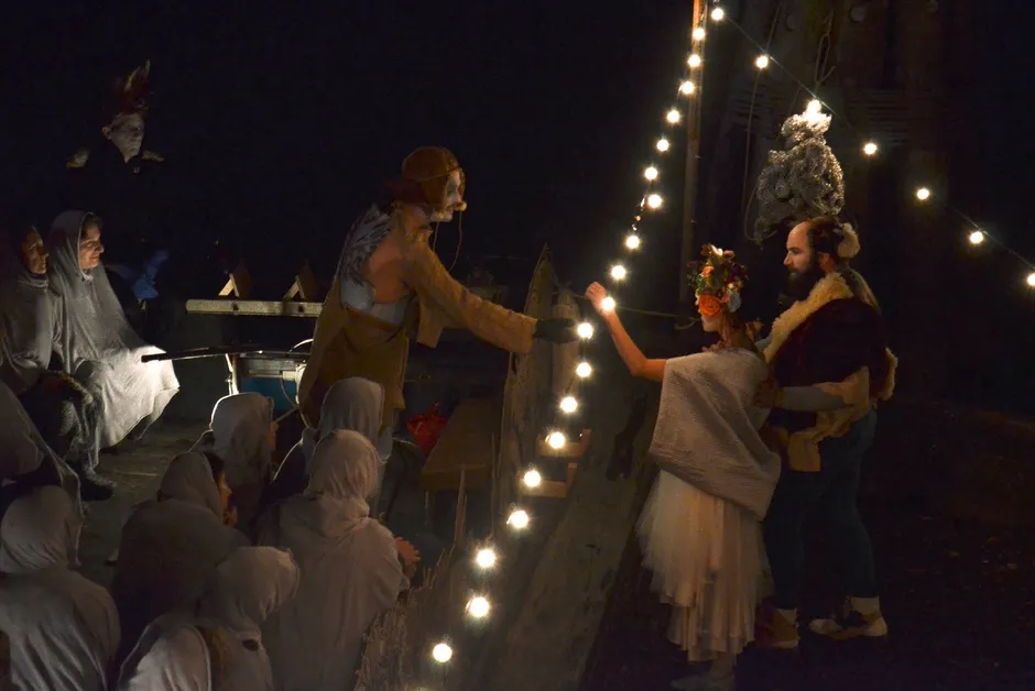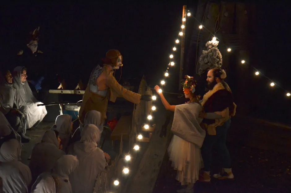 斯塔克说,至少有80人参与了这个节目的制作——大多数是志愿者,还有一些人工作了三个月,赚的钱相当于他们通常一天的收入。船本身是由国际知名艺术家 卡莱多尼亚·库里(又名Swoon)设计的;专业布景师莎拉·麦克米兰设计了介于 了不起的狐狸爸爸 和 权力的游戏 之间的破旧优雅的服装;还有许多人贡献了木工技能、视听专业知识、后勤和机械工作,都是为了参与这个项目。资金来自于一场25000美元的Kickstarter活动(有着最令人印象深刻和多样化的 奖励)以及为整个剧目的250张票的销售,其中包括为跟随的陆地观众提供的折扣名额。他们赚到钱了吗?