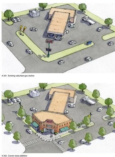 增加一个角落商店使加油站能够拥抱街道。加琳娜·塔奇耶娃在她的书 城市扩张修复手册中,城市设计师加琳娜·塔奇耶娃提出了一种改造加油站的方案。它看起来像是埃克森-首尔食品混合体的一个更大、更正式的版本。正如 华盛顿邮报去年报道的那样,加油站餐饮在大华盛顿地区正在兴起。 如果这种趋势扎根,或许更多的加油站老板会建造塔奇耶娃推荐的“衬里”附加设施。这样,巨大的郊区房地产可以逐步得到改善。