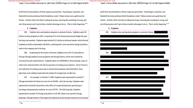 芝加哥的初步投诉被大量编辑,因为该市——通过传票获得了至少部分诉讼基础信息——与四家制药公司签订了保密协议。现在,大部分被编辑的信息已可获得。