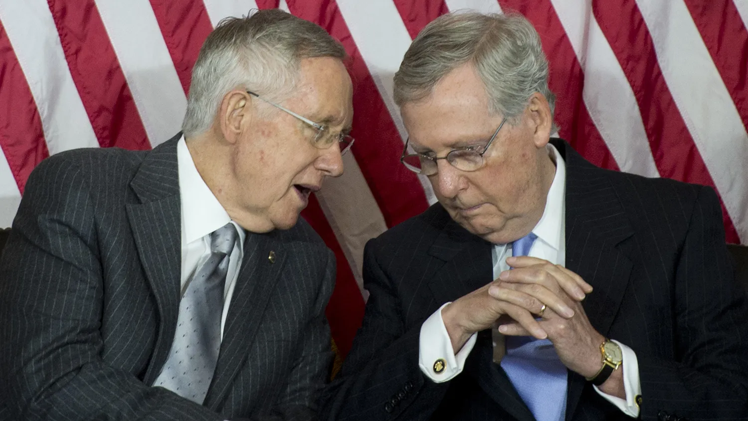 参议院多数党领袖哈里·里德(Harry Reid),民主党-内华达州,左,和参议院少数党领袖米奇·麦康奈尔(Mitch McConnell),共和党-肯塔基州,在2014年9月10日星期三于国会访客中心举行的纪念9/11牺牲英雄的金奖仪式上交谈。