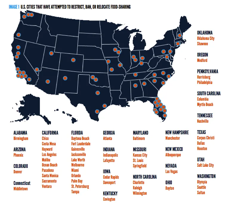 劳德代尔堡是13个通过限制食物分享的新物业规定的城市之一。劳德代尔堡的法案于10月通过,要求任何为无家可归者提供食物的组织必须同时提供洗手间设施——对于一个户外志愿者组织来说,这是一个艰巨的任务。该法令进一步限制在距离住宅物业500英尺内的任何地点进行食物分享,并要求在任何分享食物的地方必须配备特定的洗手设备。
