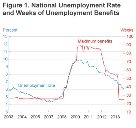 这张图表显示,失业率确实在失业保险福利变得更加慷慨的同时上升。但因果关系的箭头是从高失业率指向更好的福利,而不是从更好的福利指向高失业率。