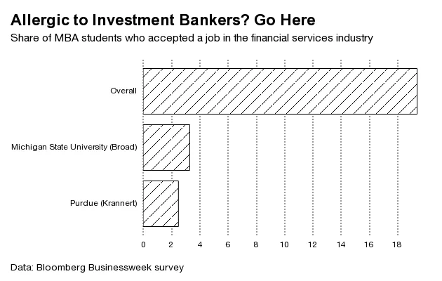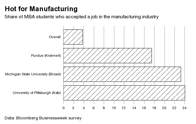 另一方面,尽管MBA求职者在相对不拥挤的制造业领域竞争时享有更好的机会,但在商学院论坛上几乎没有关于制造业的讨论。我们调查的7010名毕业MBA中,只有3.8%计划在制造业工作,这些数据是我们每两年一次的 MBA项目排名的一部分。然而,在匹兹堡大学的 卡茨商学院和密歇根州立大学的 布罗德商学院,超过五分之一的毕业生在该行业找到了工作。