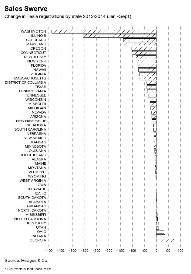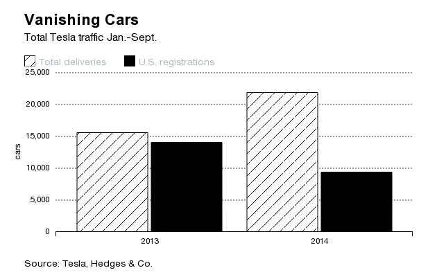 根据 Hedges & Co. 的公共记录分析,在2014年前九个月,美国特斯拉车辆的注册数量下降了三分之一,降至9,331辆。然而,在同一时期,特斯拉表示交付了21,821辆汽车,比去年增加了40%。那另外12,490辆车发生了什么?