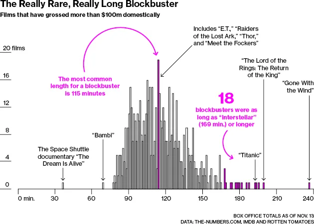 大多数大片的时长在90到150分钟之间。只有18部电影的时长与*《星际穿越》*一样长或更长。当然,这并不意味着一部长电影注定会失败。这只是意味着大热电影往往较短。