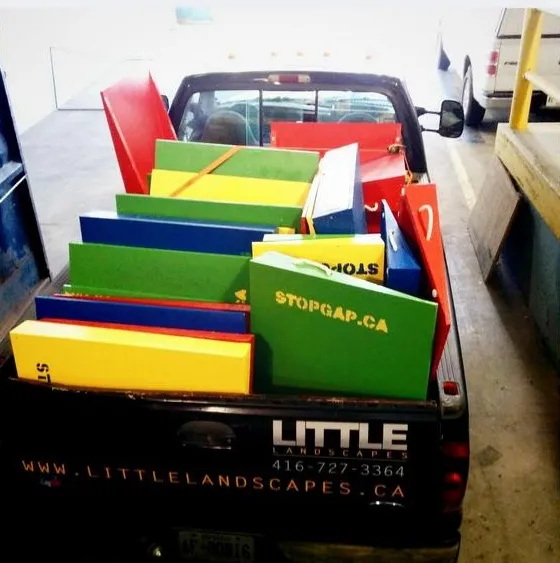 一辆准备在多伦多分发StopGap坡道的卡车StopGap志愿者们在多伦多建造了超过 400个坡道,并在加拿大其他城市使用捐赠的材料和StopGap网站上发布的建设和商业推广指南建造了更多。