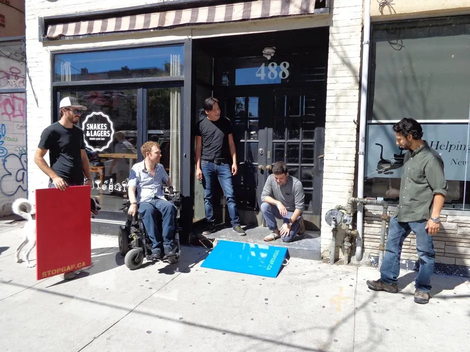 StopGap 允许腿部活动受限或使用轮椅的人轻松进出。StopGap最初,安德森和他的朋友迈克尔·霍普金斯以收费服务模式接触商店老板进行坡道建设,但永久坡道的混凝土工作成本使得这一方案难以推销。安德森说,StopGap 的可携带坡道便宜、临时——因此也绕过了任何许可程序。根据 合同,商家签署的“坡道应仅在需要时使用。”在实践中,坡道整天甚至常常过夜保持在外面;否则,潜在客户如何知道哪些商店有可以部署的坡道,然后引起员工的注意来部署它呢?