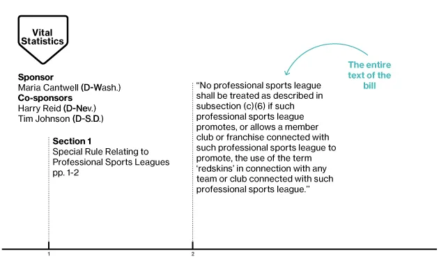 2. 9月14日,来自华盛顿州的民主党参议员玛丽亚·坎特韦尔(Maria Cantwell),曾担任参议院印第安事务委员会主席,提出立法,要求在球队保留其名称的情况下剥夺NFL的免税地位。11月12日,华盛顿特区的无投票权国会议员民主党代表埃莉诺·霍尔姆斯·诺顿(Eleanor Holmes Norton)在众议院提出了一项相同的法案。
