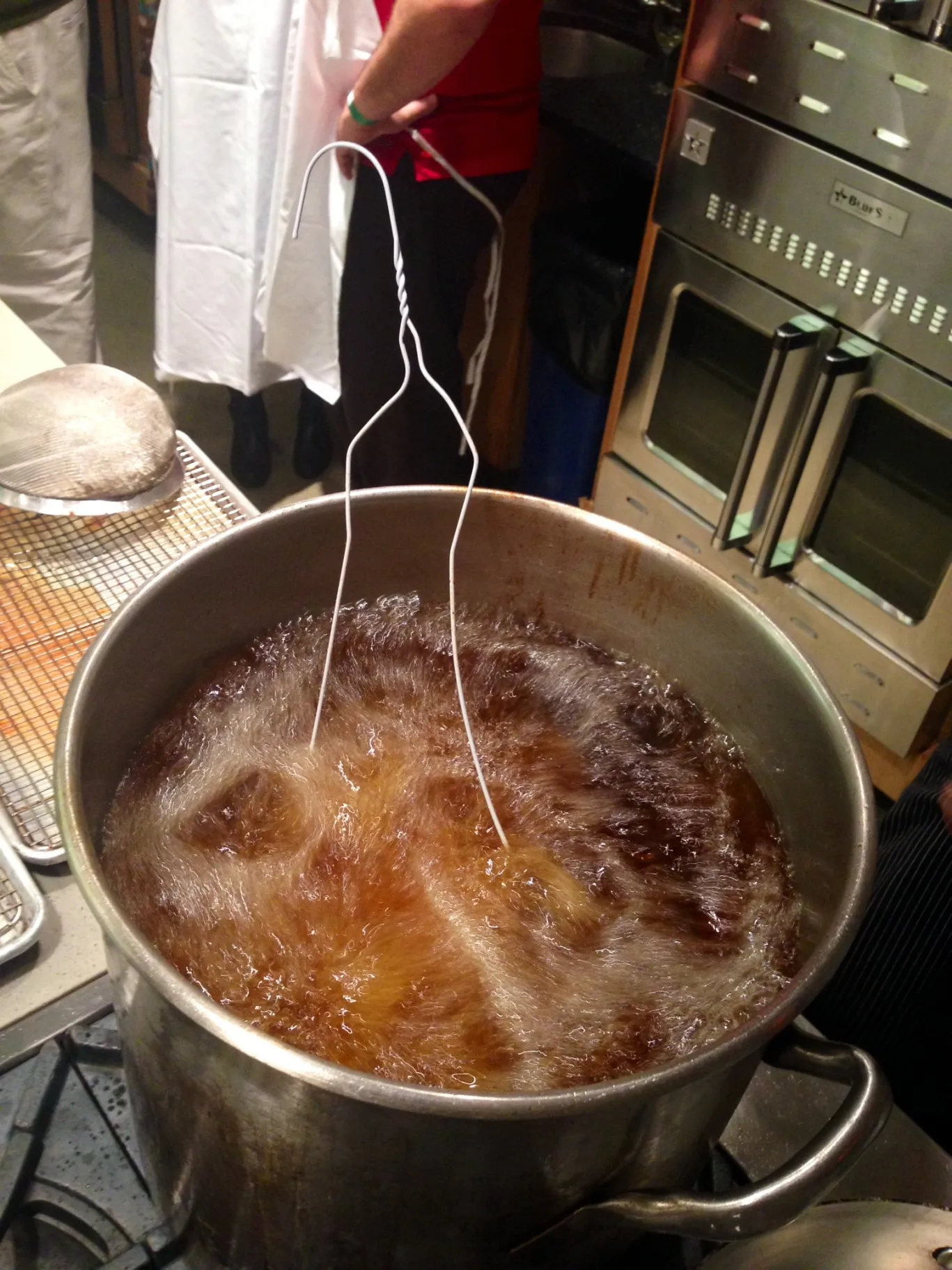 “我一直想学怎么做这个很久了,”他说。“我只需要弄清楚怎么把那个东西挂上去。”那个东西就是衣架,专业人士在ICE将12个衣架裹在单独的火鸡胸肉上,就像圣诞毛衣一样。